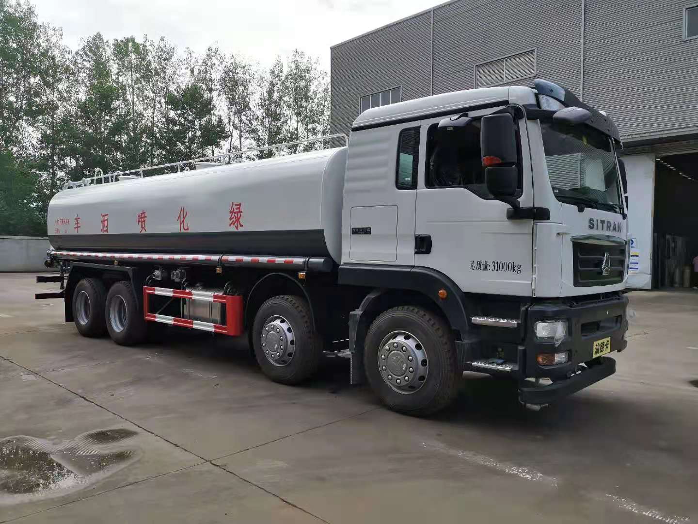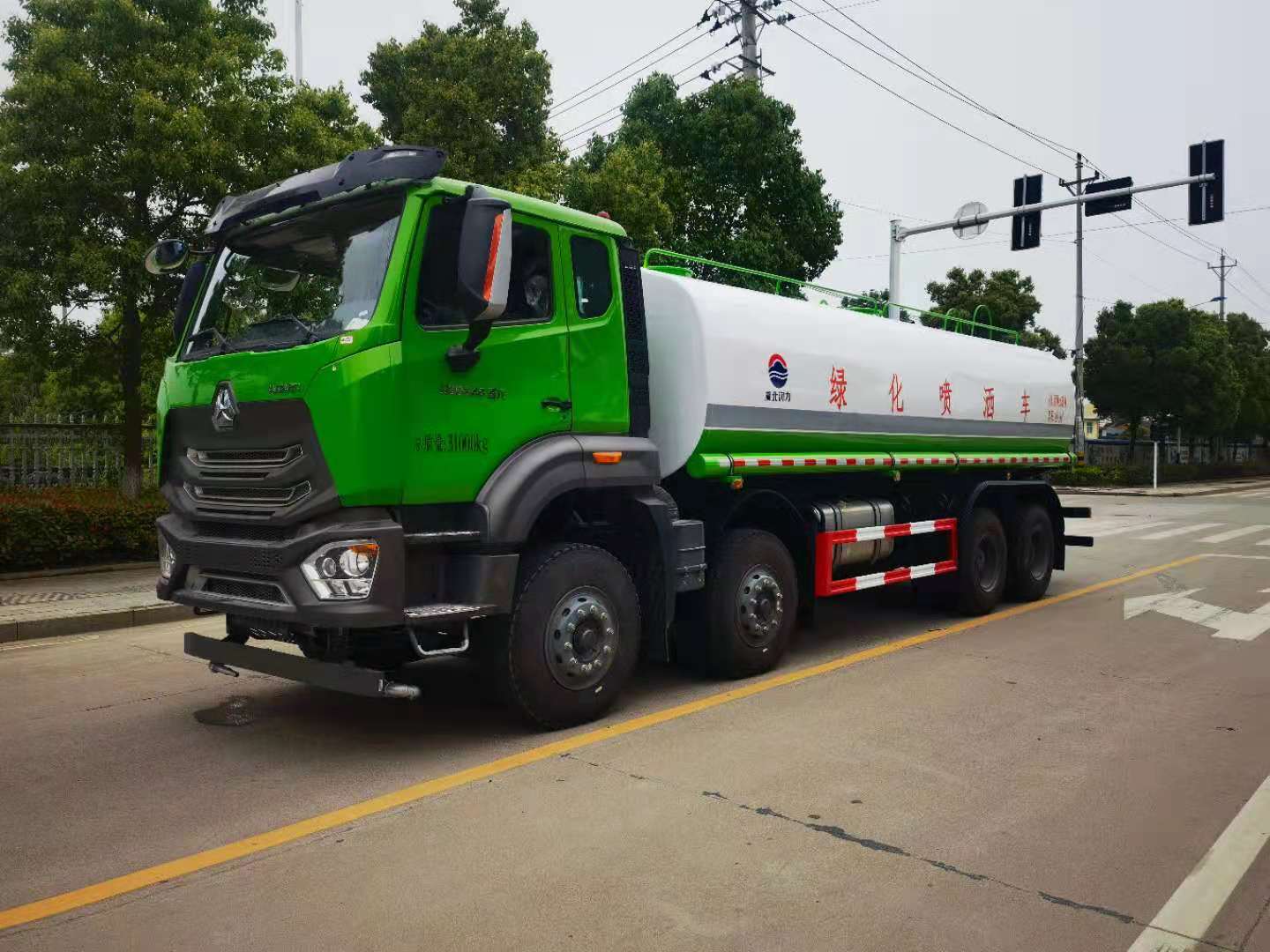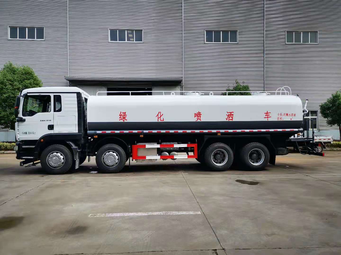 國六重汽汕德卡大容積25方水車,采用國際4mm厚鋼板,內有隔板,采用60灑水泵,可抽可排,前噴后灑,帶側噴,后平臺高射水炮,射程25米,右側兩個高位花灑,罐體顏色白/綠,采用優質油漆,