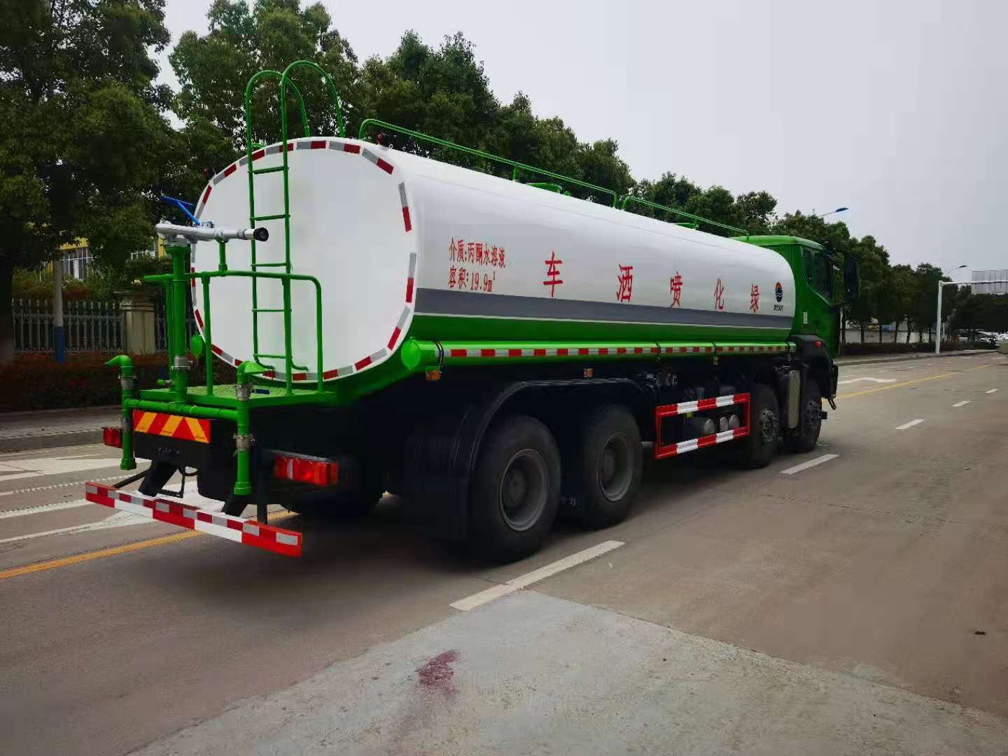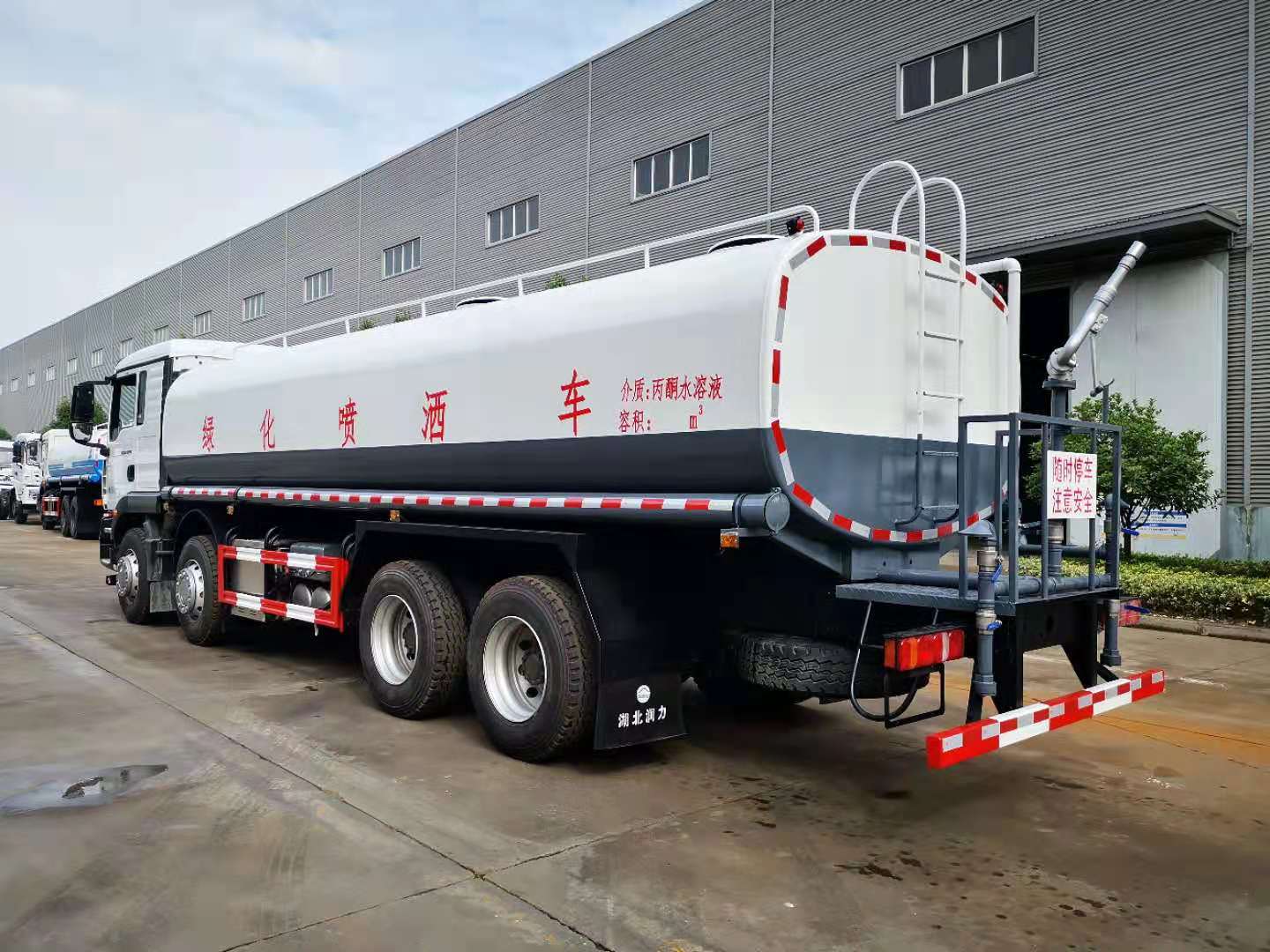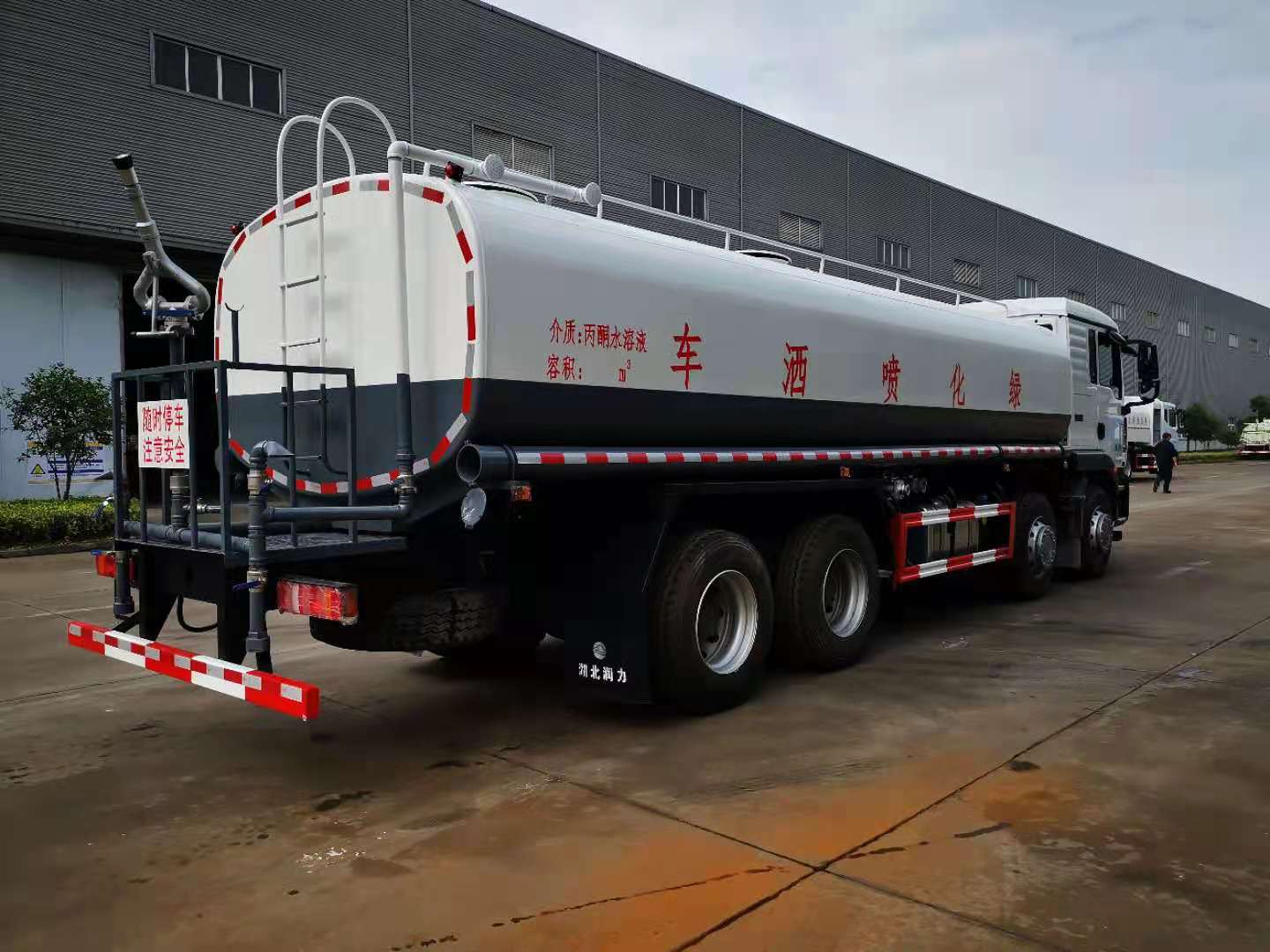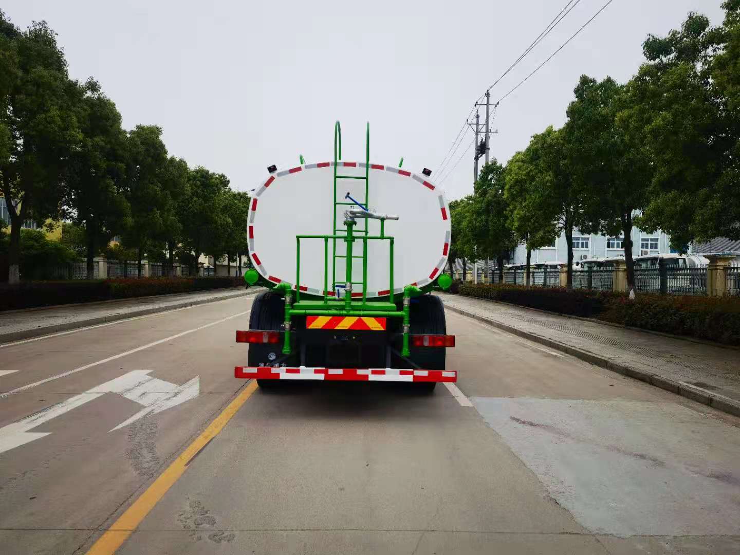 國六重汽汕德卡大容積25方水車,采用國際4mm厚鋼板,內有隔板,采用60灑水泵,可抽可排,前噴后灑,帶側噴,后平臺高射水炮,射程25米,右側兩個高位花灑,罐體顏色白/綠,采用優質油漆,